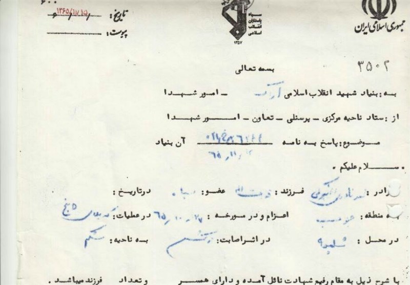 تصویر جواز شهادتی که به دست خط خود شهید نادری انجیرکی نوشته و امضا شده در ادامه قابل مشاهده است: