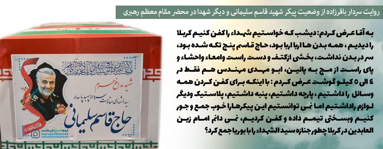 به آقا عرض کردم: دیشب که خواستیم شهداء را کفن کنیم کربلا را دیدیم، همه بدنها اربا اربا بود، حاج قاسم پنج تکه شده بود، سر در بدن نداشت، بخشی ازکتف و دست راست وامعاء واحشاء و پای راست از مچ به پائین.