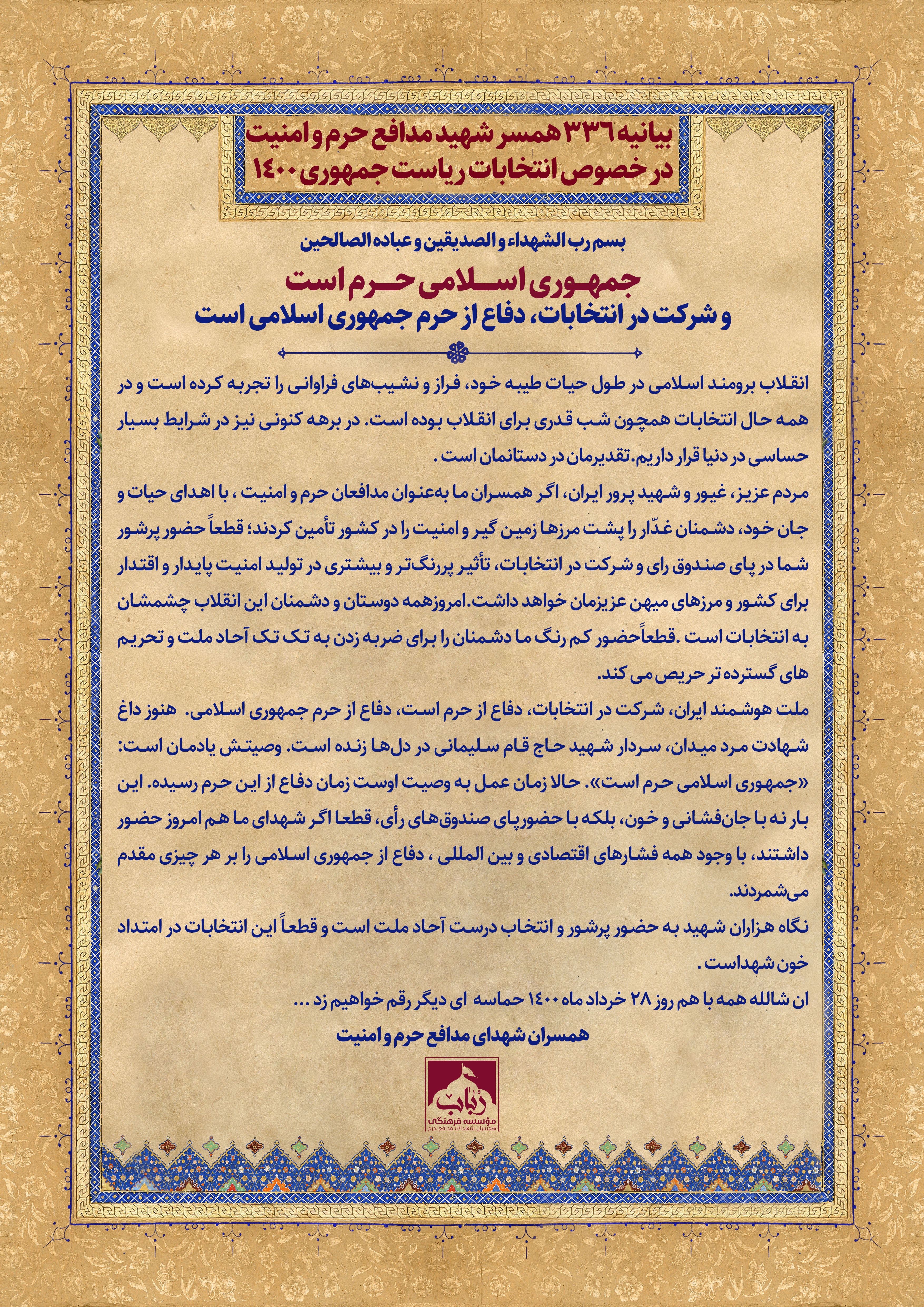 درست آحاد ملت است و قطعاً این انتخابات در امتداد خون شهداست . ان شالله همه با هم روز 28 خرداد ماه 1400