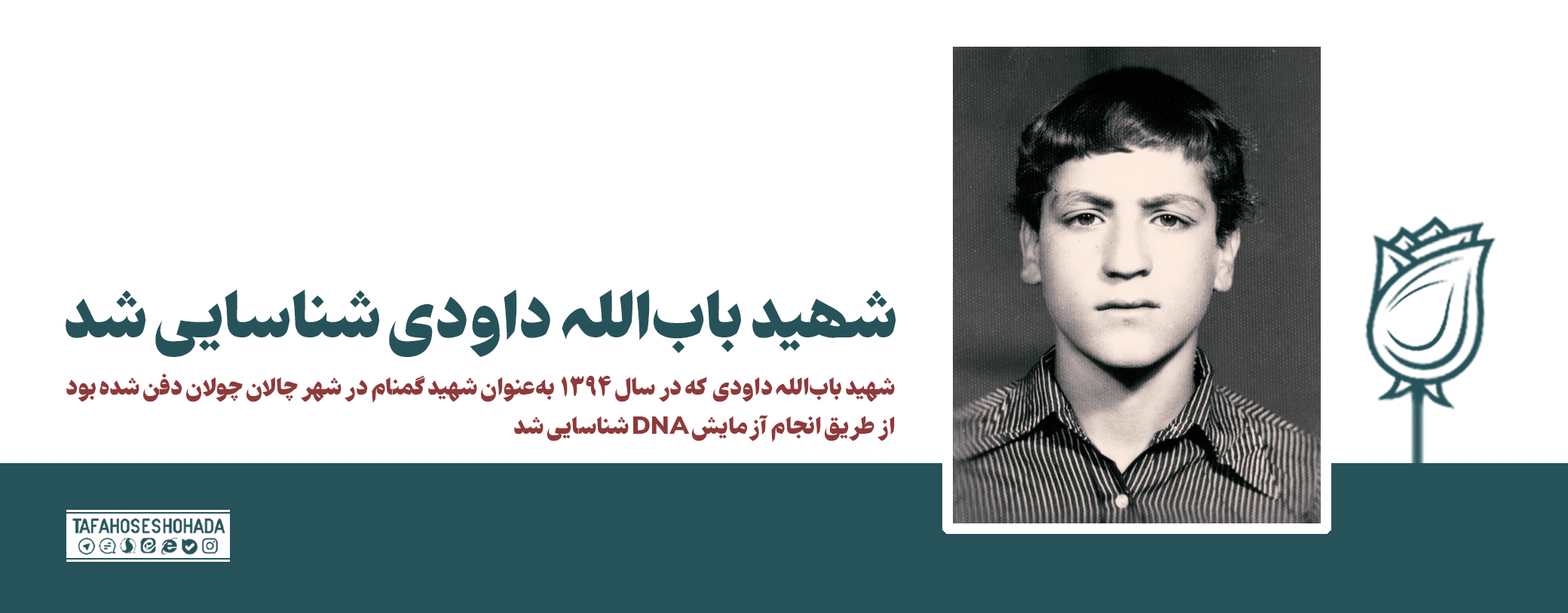 شهید باب الله داودی، فرزند نصیر، متولد 1346، جمعی لشکر 17 علی بن ابی طالب(ع) از بوئین زهرا به جبهه اعزام شد و در تاریخ 7 اسفند 1362 در عملیات خیبر در جزیره مجنون به فیض شهادت نائل آمده بود. این شهید در سال 1394 _علیرقم تلاشهای انجام شده_ پس از عدم شناسایی بهعنوان شهید گمنام در شهر چالان چولان در استان لرستان دفن شده بود.